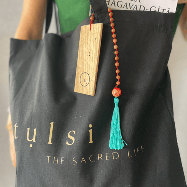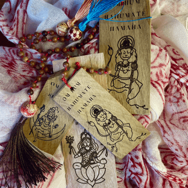 Marque-page en bois (environ 8cm de longueur) auquel 18 perles sont ajoutées servant de mini-mala. A tout moment le pratiquant peut ainsi réciter le Mantra de la divinité en égrainant les perles (par exemple 6 tours pour arriver à 108 ;-)
