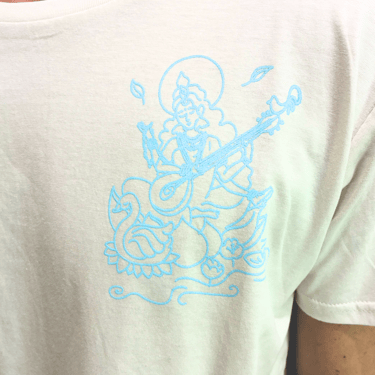 Sarasvatī , dont le nom signifie ‘la fluide’, est la Déesse de ce qui s’écoule : des rivières, des mots , de l’inspiration créative... Egalement Déesse de la Vibration, de la Musique, des Mantras, de la Parole et des Arts, elle nous accorde à la fréquence divine en jouant de sa Veena.